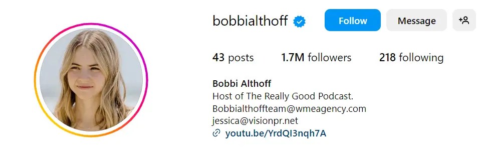 As Bobbi Althoff continues to leave her mark in the Influencer industry, her dedicated fanbase eagerly anticipates witnessing her growth and talent on screen. On her Instagram, @bobbialthoff, she generously shares both her professional and personal moments, offering a glimpse into her Podcast projects, behind-the-scenes traveling experiences, and snippets of her day-to-day life.