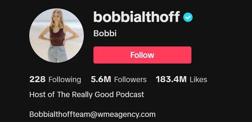 Initially she started her career as a Short-form content creator on TikTok where she used to make comedic and sarcastic married life and parenting tips videos. She also did fashion try-on videos, beauty routines, Vlogs, GRWM etc and garnered 7m+views on tiktok and her amazing content. As her videos gained traction, the floodgates of social media opened wide for Bobbi Althoff. Her fashion advice and fun content garnered attention from people of all ages and backgrounds, transforming her into a genuine internet sensation.